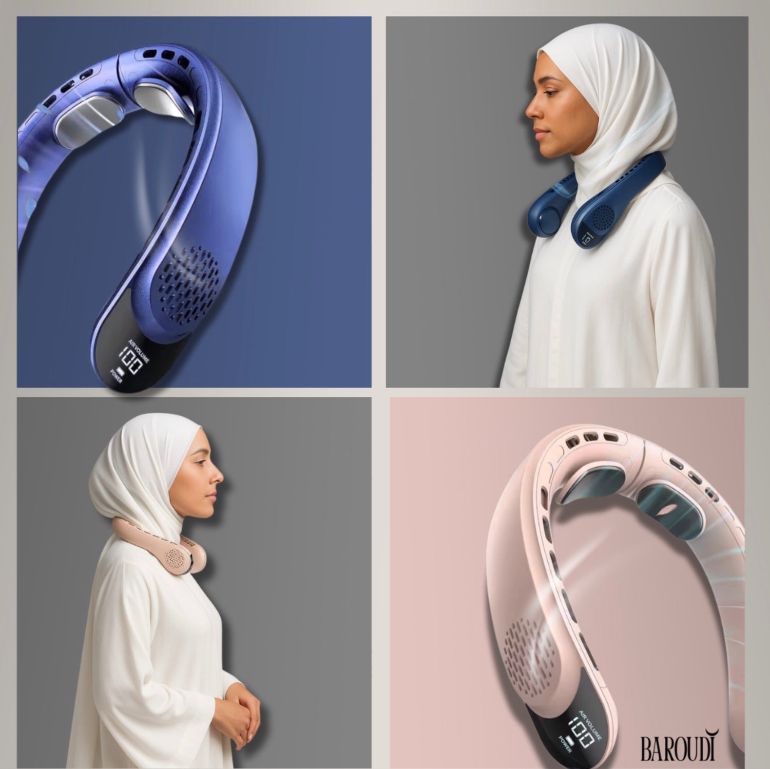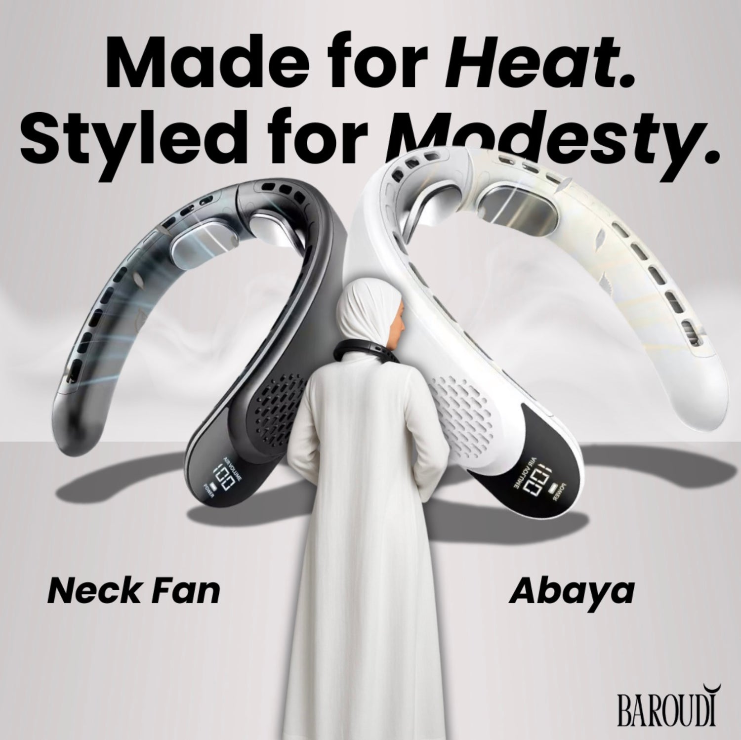 Baroudi is more than just a fan — it’s designed with your lifestyle, comfort, and modesty in mind. Unlike ordinary neck fans, Baroudi offers a discreet fit that works seamlessly under abayas, hijabs, and scarves, providing powerful cooling without compromising your appearance. Its lightweight build, whisper-quiet motor, and long-lasting battery make it the perfect choice for daily life in hot climates as well as for the sacred journeys of Hajj and Umrah. Wherever the heat follows, Baroudi keeps you cool, confident, and comfortable.