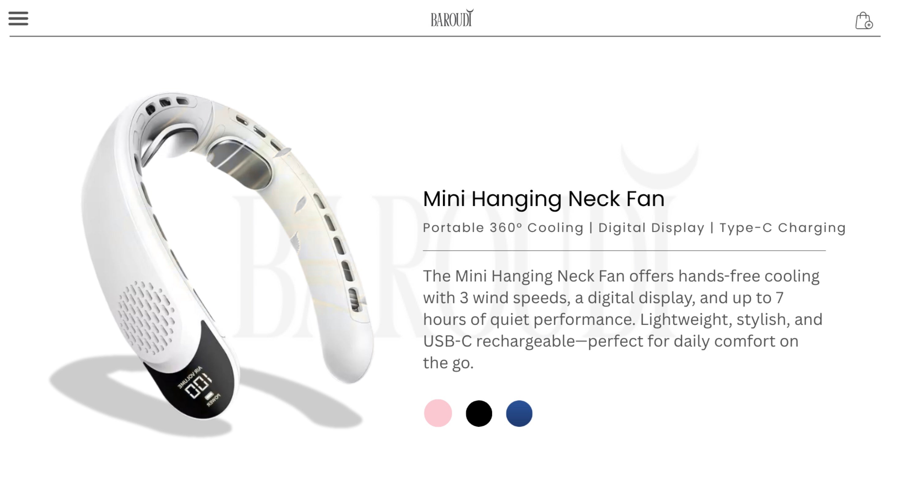 With a rechargeable battery and multiple speed settings, the Baroudi Neck Fan is built to keep you refreshed throughout your day—whether shopping, traveling, or spending time outdoors.